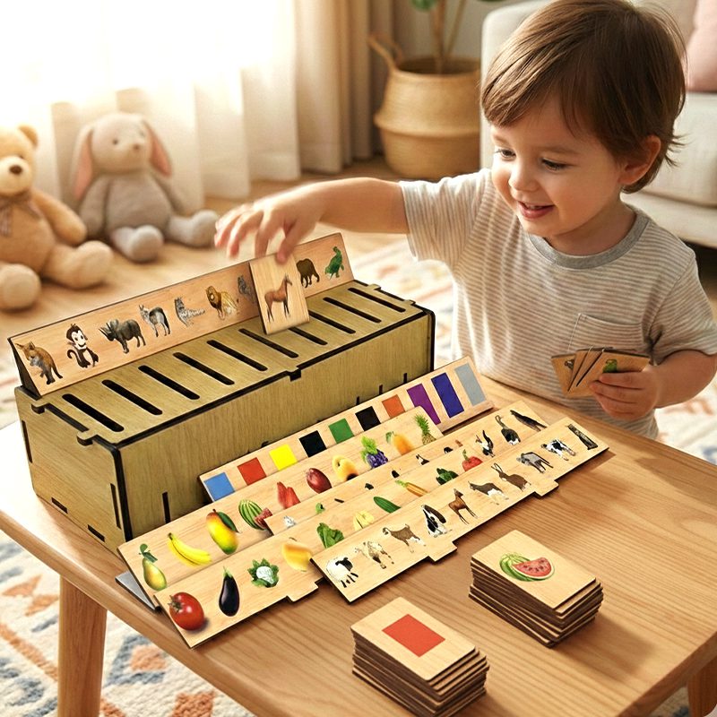 مثلا يكون قدامه كروت الفاكهة والخضار وتطلبي منه يصنف كل نوع لوحده